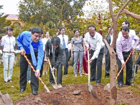 Đồng chí Nguyễn Đắc Vinh (áo xanh) trồng cây xanh tại Bắc Giang